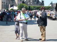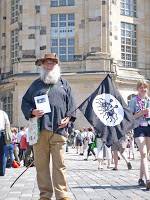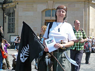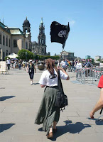 Da waren wir also, auf dem Kirchentag. Auf Einladung von GeFAHR e.V., dem Organisator der Religonsfreien Zone in der Schauburg Dresden, waren wir angereist. Weil das keine Gegenveranstaltung war und Religiöse keinesfalls ausgeschlossen, durften wir dort eine Nudelmesse halten. Noch war es aber nicht so weit. Deshalb mischten wir uns erst mal unters Kirchenvolk. Überall wimmelte es von deren grünen Schals. Weil sich manche von ihnen aber als heimliche Piraten outeten, indem sie den Schal als Kopftuch trugen, fühlten wir uns richtig heimisch und hissten erst mal unsere Flagge vor der Frauenkirche.