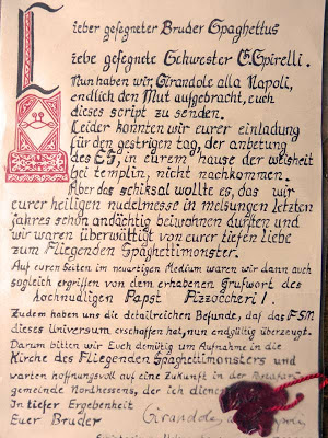 Allein den wunderbar verzierten Anfangsbuchstaben so zeichnen zu können, ist ein klarer Hinweis, Girandoles alla Napoli gehört zu uns wie das RAmen zum Monster. Da macht es auch überhaupt nichts, wenn der Bruder sich wohl von der Website der EvKdFSMiD (Erste Vereinigten Kirche des FSM in Deutschland), dem Unternehmen von Bruder Bucatini, in die Irre führen lassen hat, denn nur dort gibt es einen Papst. Wobei diese Verwechslung verständlich ist, denn wir arbeiten zusammen und überlegen sogar, uns zu vereinigen. Dann würde unsere Website www.pastafari.eu auf der besser eingeführten Adresse venganz.info laufen.