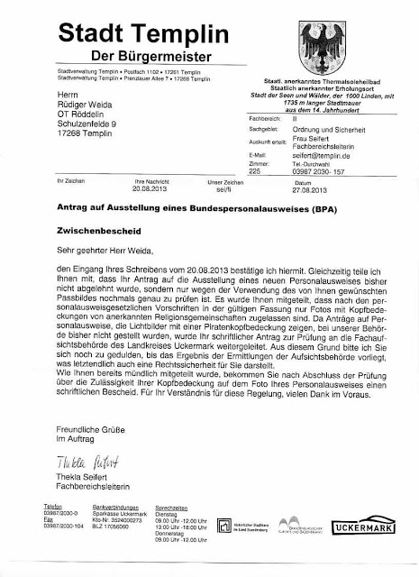 Der aufmerksame Leser wird festgestellt haben, dass die Behörde also (oberes Schreiben) ein Passbild beurteilen möchte, dass sie gar nicht mehr hat (unteres Schreiben). 🙂