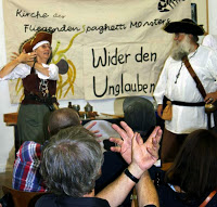 Als nächstes gings jedoch erst mal nach Düsseldorf. Eingeladen hatte uns der DA, der Düsseldorfer Aufklärungsdienst. Wirklich `ne tolle Truppe mit der es unwahrscheinlich Spaß gemacht hat. Das sieht man sicher auch auf den Bildern. Ein besonderer Erfolg war dort noch, dass nun auch in Düsseldorf eine Pastafarigemeinde in Gründung ist.