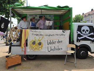 Anders lief´s bei uns. Die Bürgerinitiative „(K)eine Million“ hatte uns eingeladen. Die Bühne war zwar ziemlich klein, aber wir konnten trotzdem den Dresdner Rekord knacken. Damals waren bei unserer Messe etwas über 40 Ungläubige zum Pastafaritum konvertiert. In Leipzig nahmen 51 am Abendmahl teil. 17 von ihnen haben sich anschließend sogar zur Gründung der Gemeinde Leipzig zusammen gefunden. Möge sie wachsen und aktiv werden.